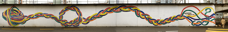 8 Wandbemalung SBB-Unterführung Rüeggisingerstrasse Spontane Anwohner und Passanten haben uns gehofen, 60m Bahnunterführung zu gestalten. Verknotet, verflochten, durcheinander, kreuz und quer verwoben und miteinander spielend – ein Abbild unseres Zusammenlebens? ø;
